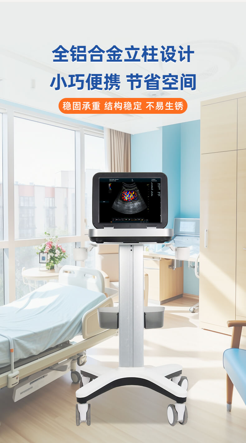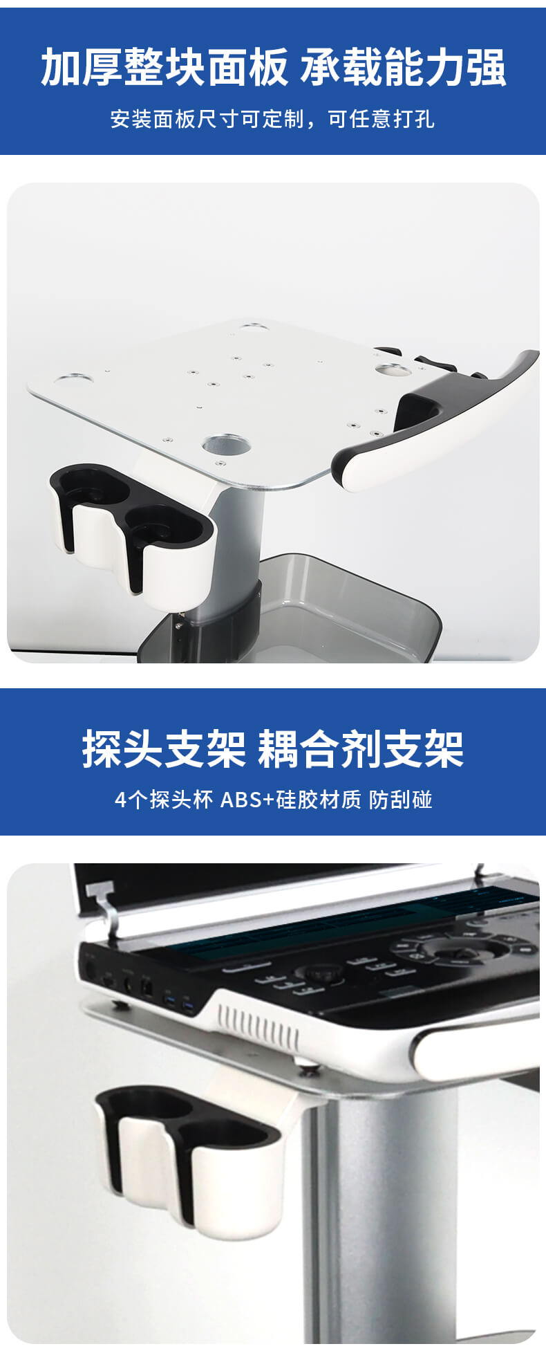 MA102/MA302四轮快拆式移动笔记本超声大推车产品尺寸:570*530mm产品材质:铝合金静音轮:4寸x4个储物篮尺寸:345*270*80mm安装面板尺寸:385*340mm单台包装尺寸:870*620*230mm包装重量:13.8Kg产品特点全铝合金立柱设计,大底座稳定架构,全静音轮带刹车,带2个双孔探头架。选配附件收纳筐、绕线器、探头支架、耦合剂支架。定制延伸1.立杆高度可定制。2.安装面板尺寸可定制,可任意打孔。