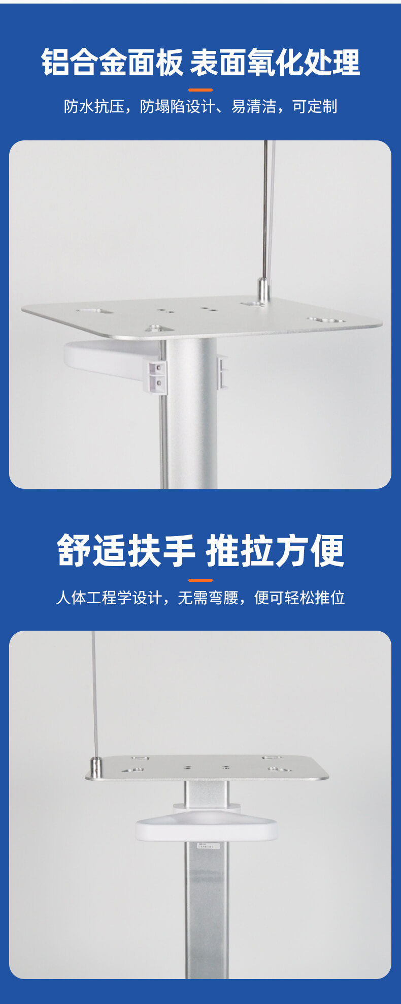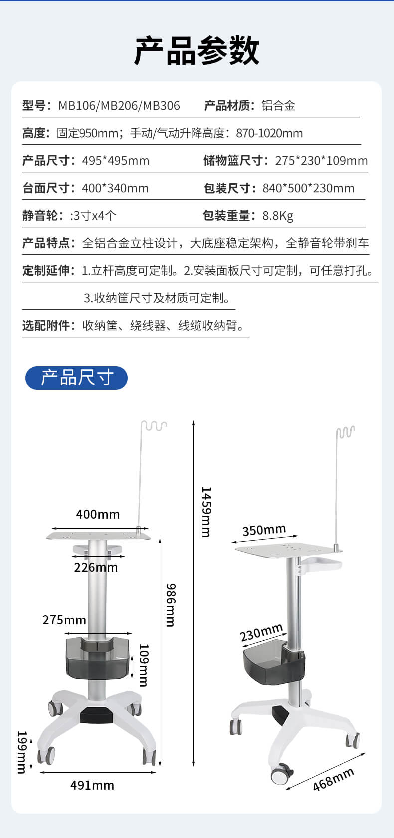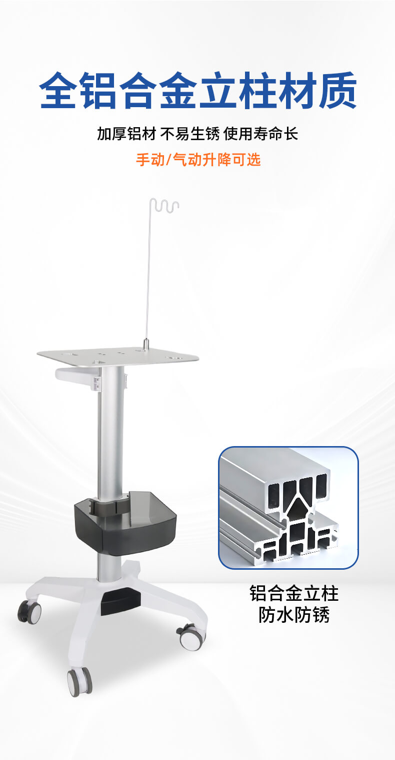 全铝合金立柱设计,小巧设计节省空间,全静音轮带刹车。